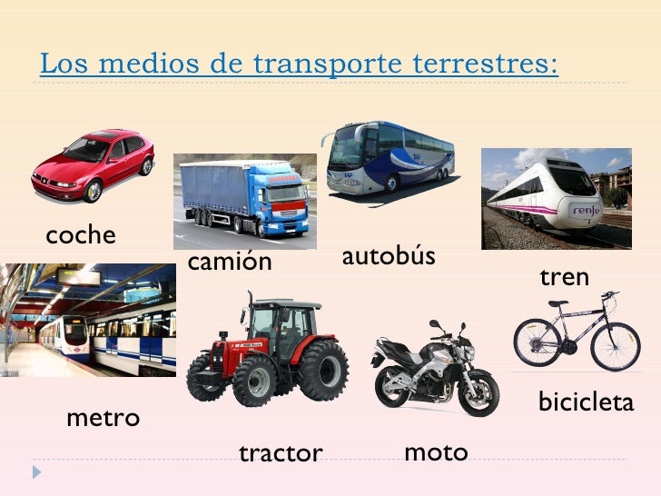 Terrestres, como: Automóvil, Bicicleta, Motocicleta, Autobús, tren.